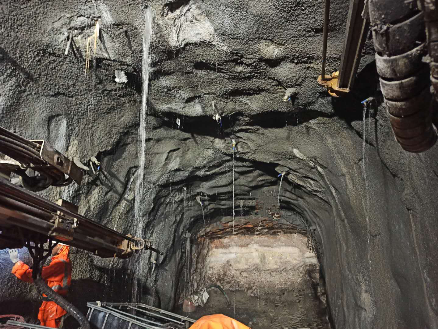 The breakthrough between service ramp and light-duty ramp is a critical task in phaseⅡ capital construction for the Owner, which also has a great impact to the entire work schedule. The work is designed with a total length of 926m, net profile of 4.2m×4.2m, at -17.5% gradient, and bolt & mesh support above waist line.The development work was suspended to address large water inflow when progressed to the aquifer (K0+563mL) on November 14, 2019, and then resumed on April 20, 2020 after substantial pumping and grouting were completed (curtain grouting at development ends and grouting behind lining implemented). Although development works were recovered since April, the progress was quite slow as up to 150m³/h water inflow was still encountered for the existence of aquifer.